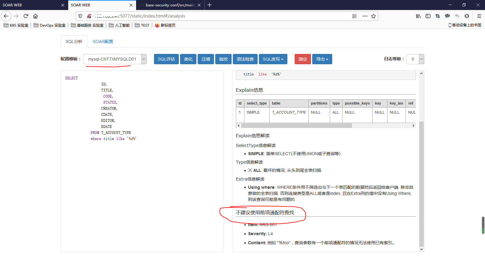 首先,选择配置参数“mysql-CNT7XMYSQLD01”,然后输入要检查的SQL,如下图:得到检查SQL的结果