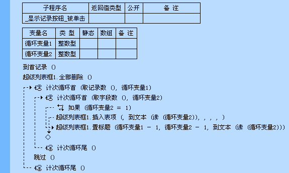 使用2个“记次循环”将所有记录所及有字段的内容添加到“超级列表框”中的指定列中,第二个记次循环的循环次数,使用“取字段数”命令取出,有几个字段就循环几次,每次循环就向超级列表框的指定列添加对应字段的内容。