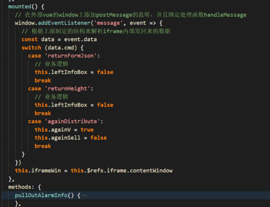 如图中的 this.iframeWin = this.$refs.iframe.contentWindow 【拿到iframe的window对象】