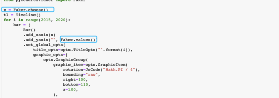 可以看到x轴调用了 Faker.choose() ,y轴调用了 Faker.values() 打印我们单独调用一下出来看看