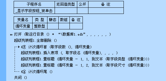 使用记次循环,将数据库中所有字段的字段名、字段类型和字段尺寸取出,并显示在超级列表框中,注意:“取字段类型 ()”命令返回的是一个整数值,所以可以参照上面命令的解释来判断返回值的实际意义。