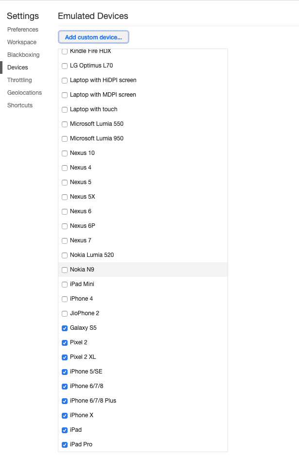 Chrome开发者工具中已经设置好的设备类型非常多,可以在开发者工具->Settings->Devices中查看,如下图: