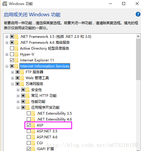 2、 找到Internet信息服务(即IIS)按照下图所示勾选IIS服务器所需组件: