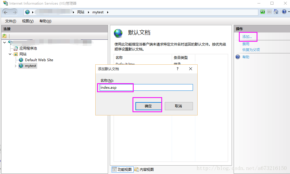 8、将index.asp作为默认文档。选中“mytest主页”下方的“默认文档”,右击“打开功能”,添加默认文档。