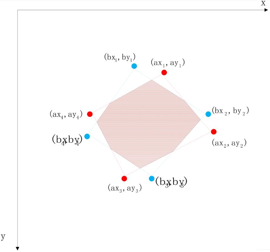 图像的坐标如上图所示,大致的想法就是四个点可以确定四条线,然后进行判断,在红色区域中则为面积中的一个像素,否则不在。先求四条线的斜率