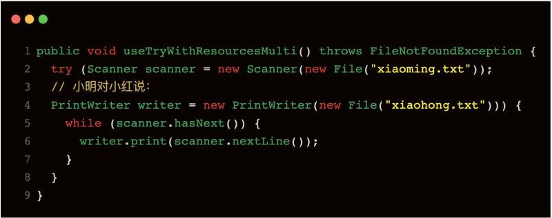 其实,在JDK 7就已经引入了对try-with-resources的支持,它的主要作用就是解放小明和小明小伙伴们的双手,帮助我们自动释放使用过的资源(比如输入、输出流)。