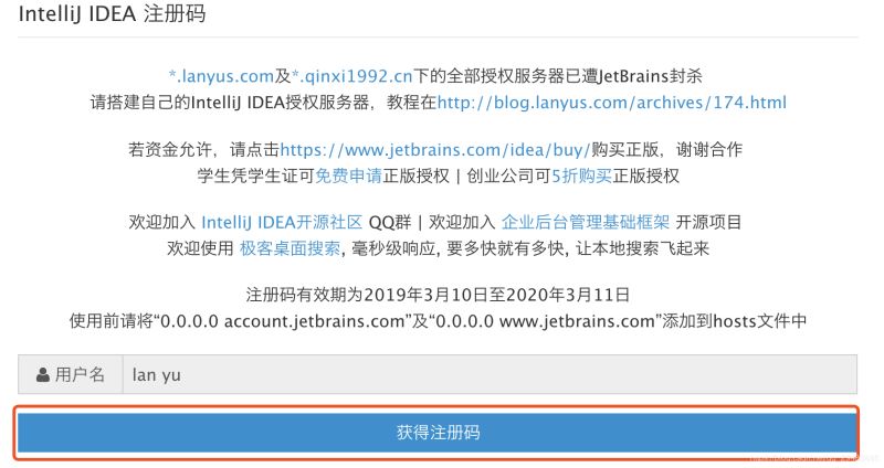 4.获取注册码地址:http://idea.lanyus.com/