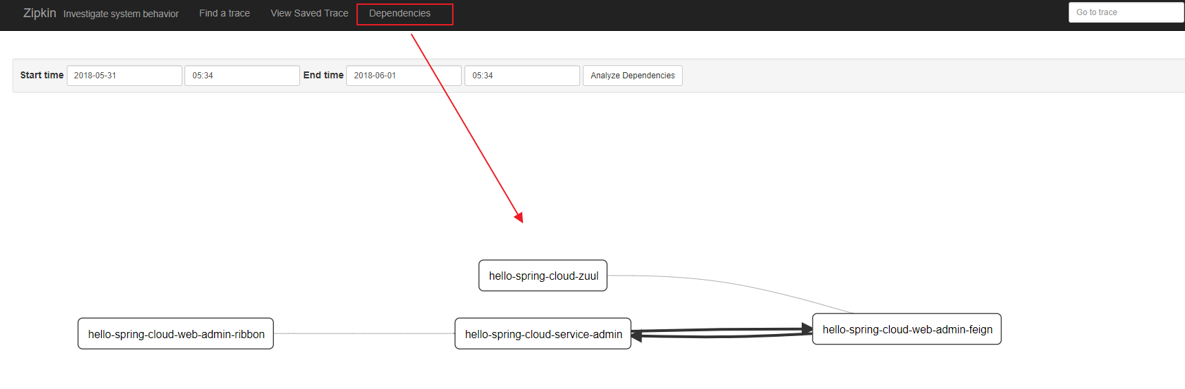 每个服务向 Zipkin 报告计时数据,Zipkin 会根据调用关系通过 Zipkin UI 生成依赖关系图,显示了多少跟踪请求通过每个服务。该组件可以让我们通过一个 Web 前端轻松的收集和分析数据。例如用户每次请求服务的处理时间等,可方便的监测系统中存在的瓶颈。