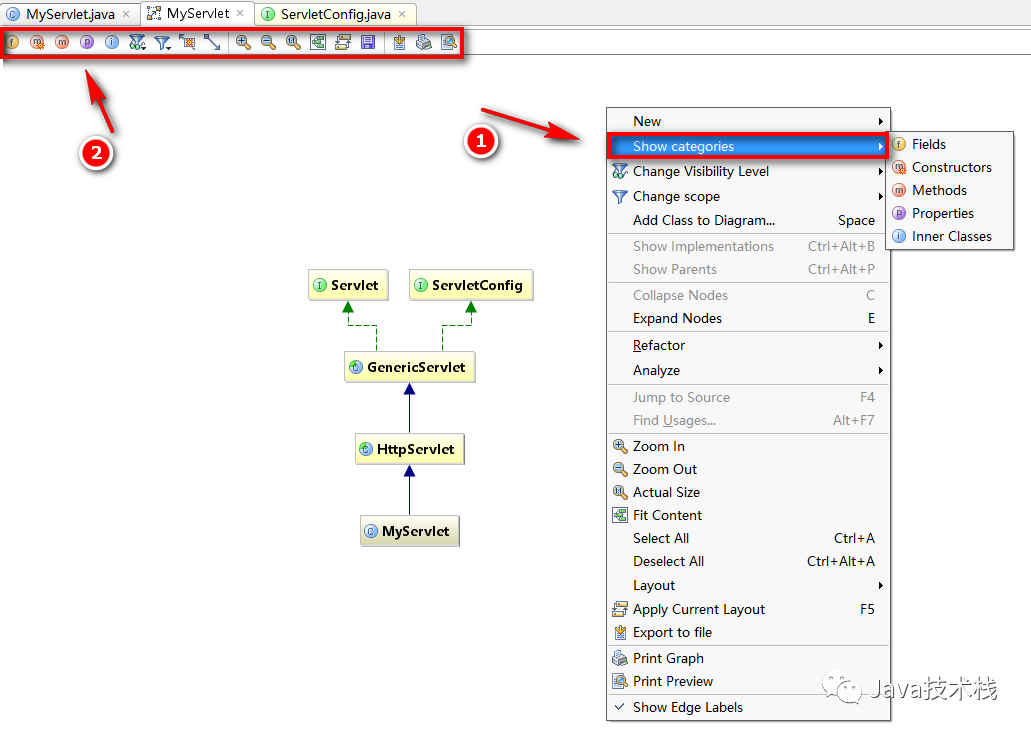 在页面点击右键,选择 show categories,根据需要可以展开类中的属性、方法、构造方法等等。当然,第二种方法也可以直接使用上面的工具栏: