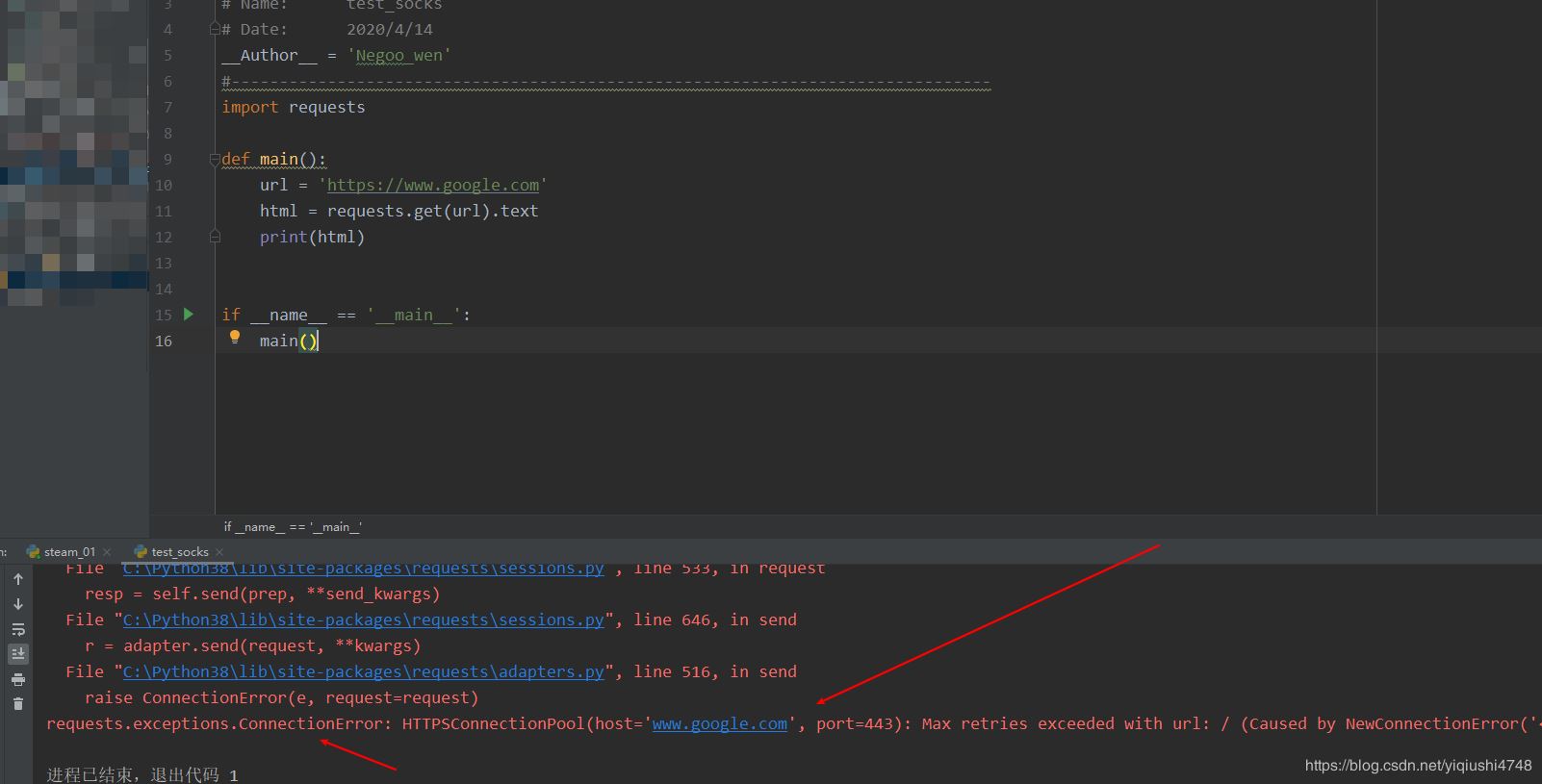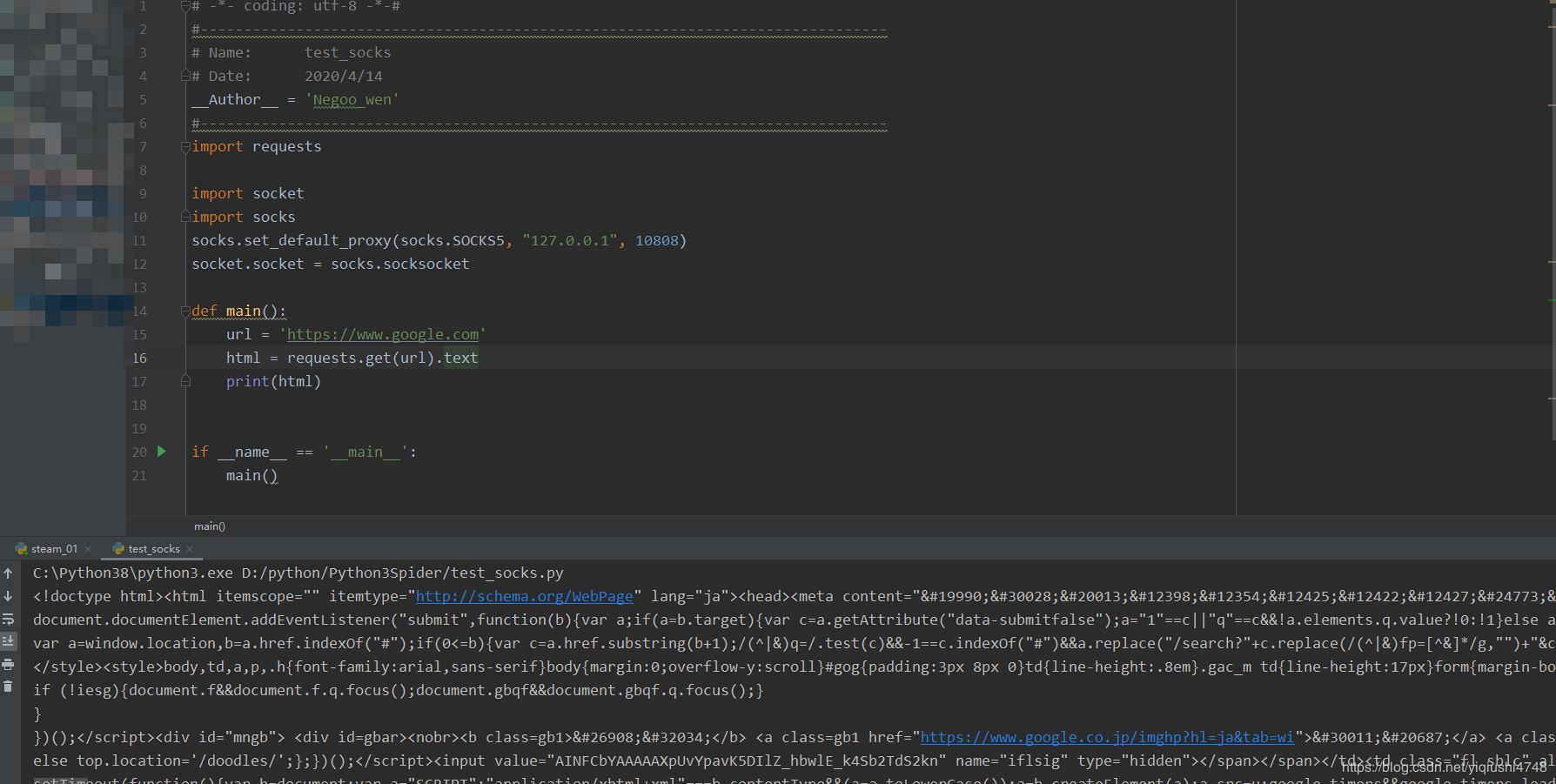 # -*- coding: utf-8 -*-# #------------------------------------------------------------------------------- # Name: test_socks # Date: 2020/4/14 __Author__ = 'Negoo_wen' #------------------------------------------------------------------------------- import requests import socket import socks socks.set_default_proxy(socks.SOCKS5, "127.0.0.1", 10808) socket.socket = socks.socksocket def main(): url = 'https://www.google.com' html = requests.get(url).text print(html) if __name__ == '__main__': main()