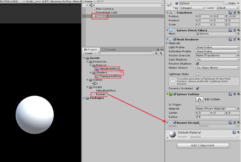 2 场景中创建一个Sphere(球体),挂上Runner脚本,运行,点击屏幕任意位置,球体就会表现出受击的边缘光效果了