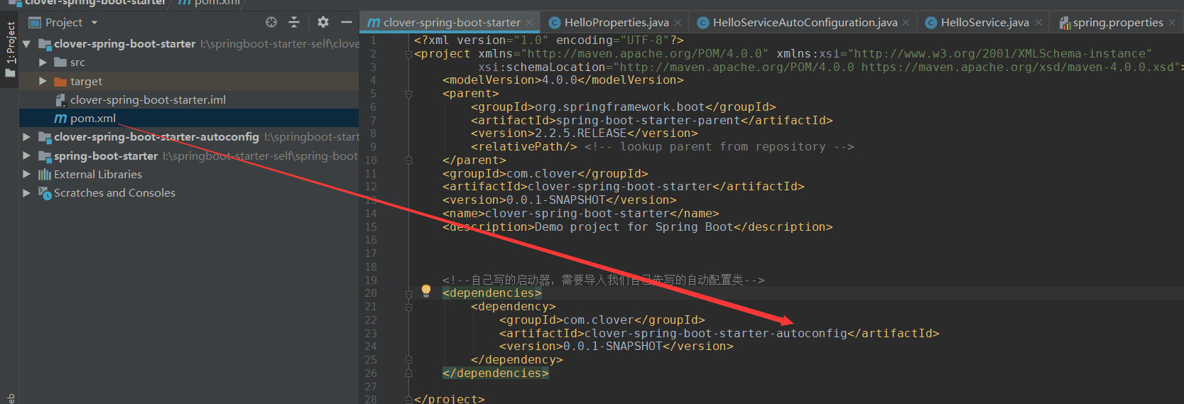 其实总结起来也就是说,starter项目模块在pom文件中引入了autoConfiger这个项目,所以starter里面可以使用autoConfiger里面的东西。