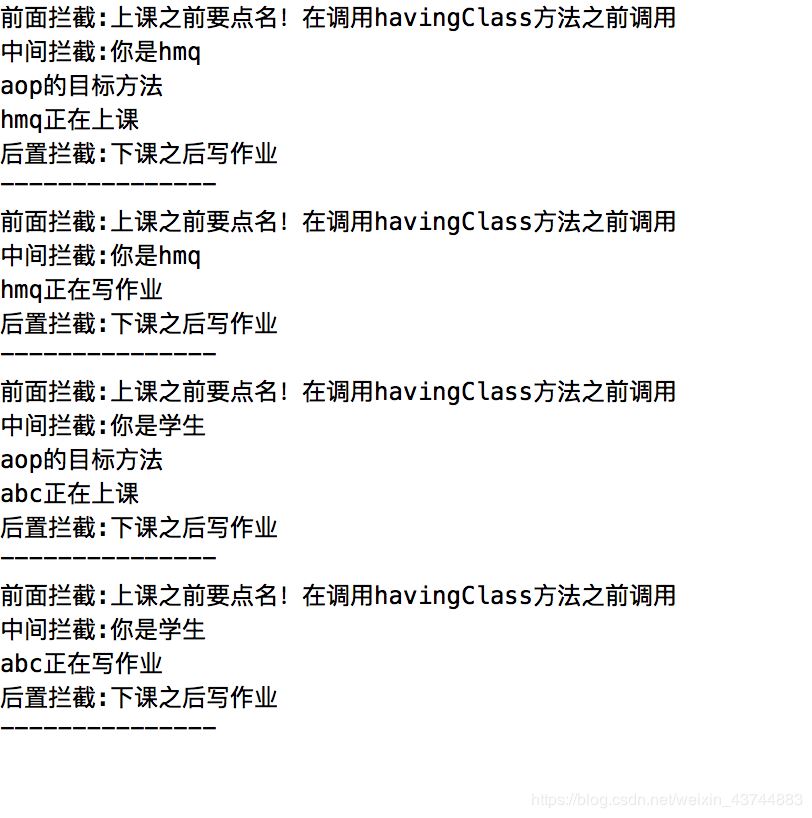 System.out.println("前面拦截:上课之前要点名!在调用havingClass方法之前调用");