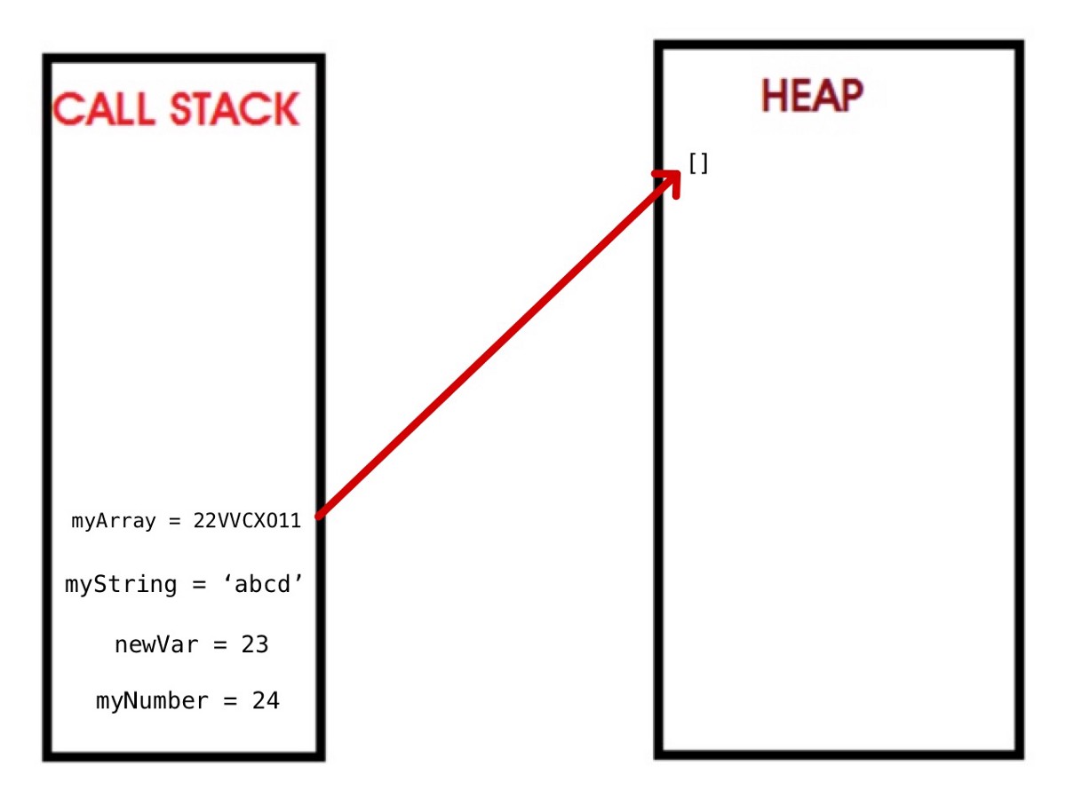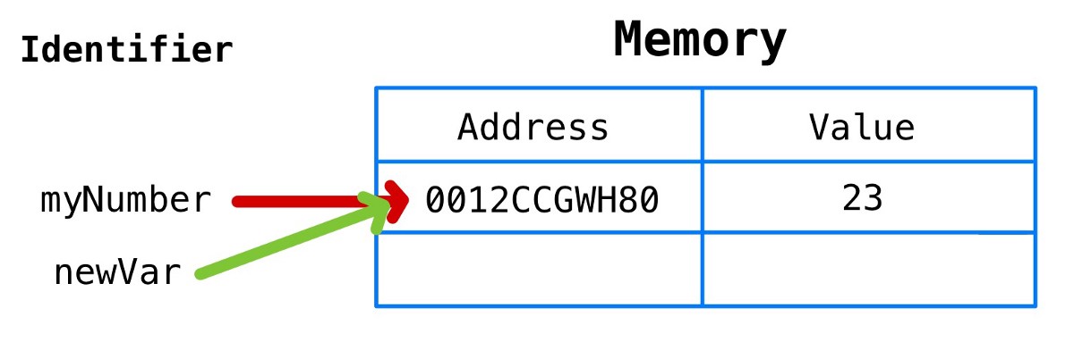 通常我们会说:“myNumber 等于 23”,但从技术上讲,myNumber 等于一个内存地址,那儿保存着一个大小为 23 的值。理解这段话十分关键。