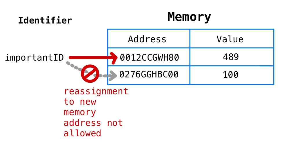 const importantId = 489 importantId = 100 // TypeError: Assignment to constant variable