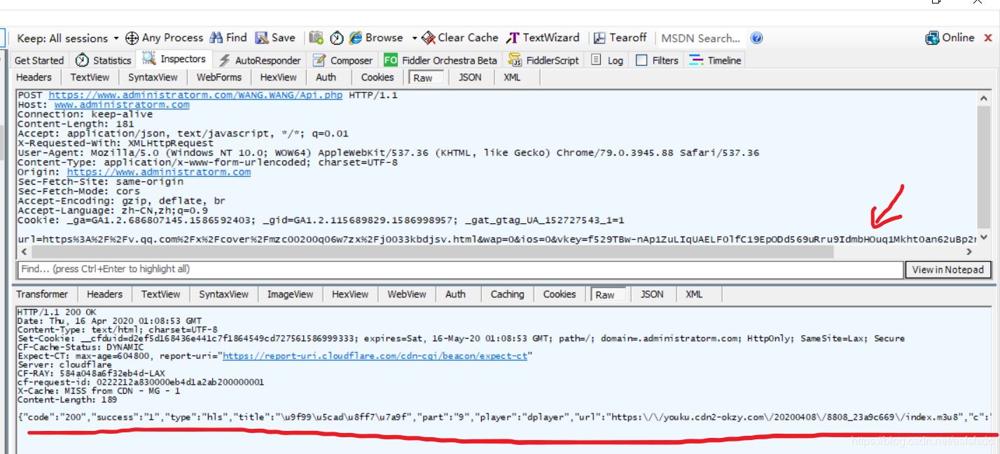 我使用Fiddler抓包,首先,浏览器进入接口,这里随便加一个vip电影的链接,然后来看post请求: