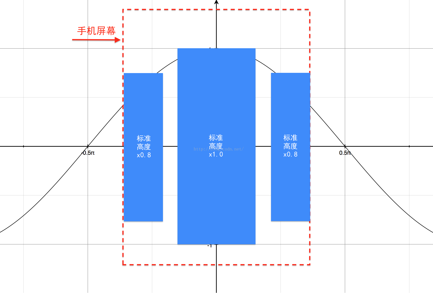 如下图所示假设方块从位置1到位置2向左移动了长度a(写代码时需要做角度和长度的转换),那么在曲线上b的值为cos(a),假设b=0.8,那么就在位置2的时候把高度缩短为原来的0.8倍,以此类推越趋近于控件中轴线的位置卡片越长。(这里角度和长度的转换倍数依情况而定)