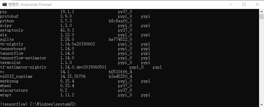 现在是默认环境,输入要安装的第一个tensorflow版本:pip install tensorflow==版本号