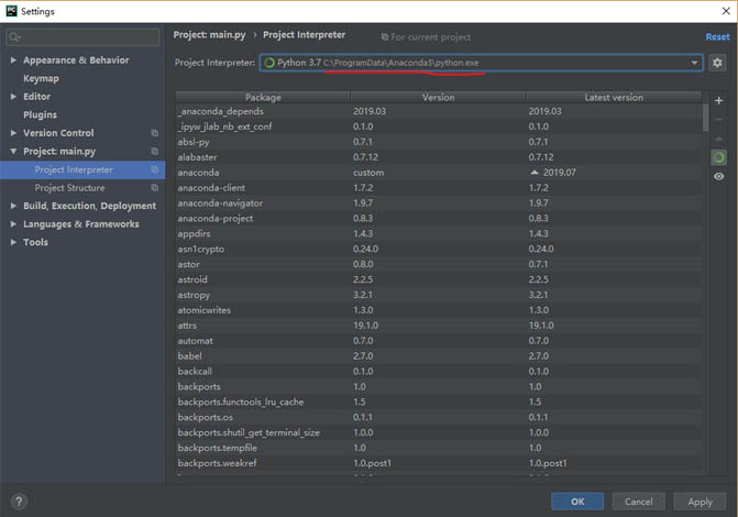 File -> settings -> project ->选择对应环境下的python解释器即可