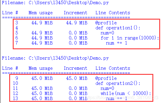 from memory_profiler import profile @profile def operation1(): num=0 for i in range(10000): num += 1 @profile def operation2(): num=0 while(num < 10000): num += 1 if __name__ == "__main__": operation1() operation2()