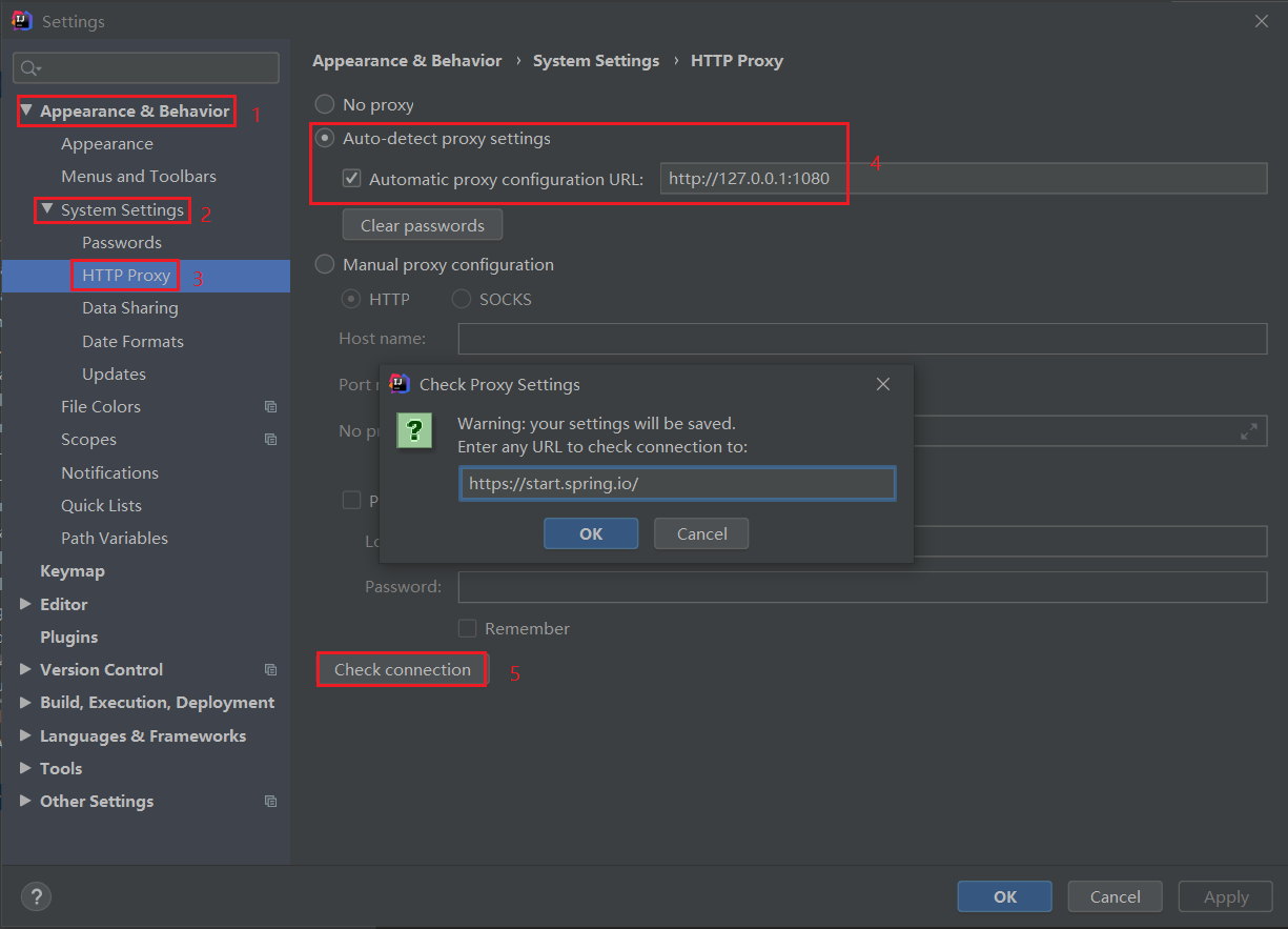 点击“Check connection”测试一下配置,输入 https://start.spring.io ,提示连接成功,就说明弄好了。