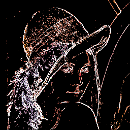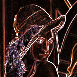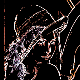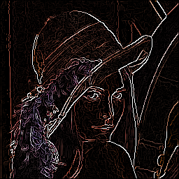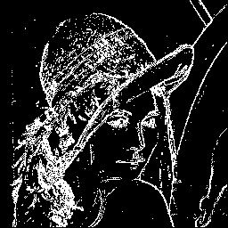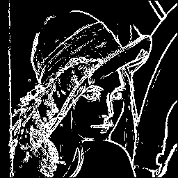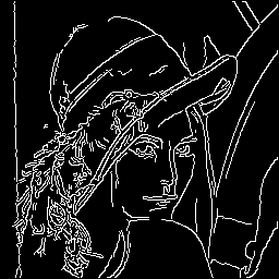 下面是对Lena图计算Canny边缘检测的梯度模图和二值化图,高斯半径2,高阀值100,低阀值50。
