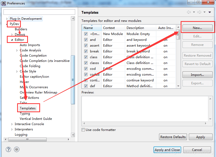 Preferences窗口,点 PyDev --> Editor --> Templates,再点右上角的新建(New),进入新增模板窗口(New Template)