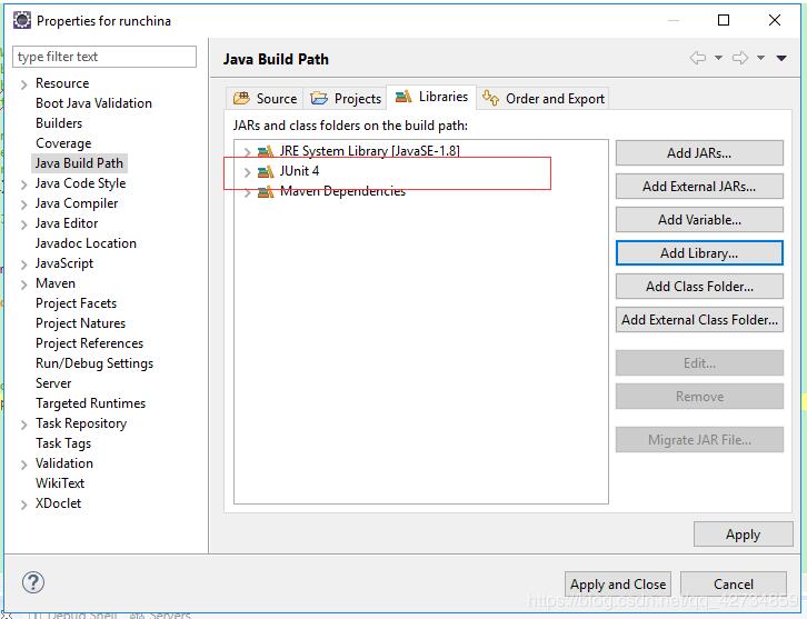 Maven 项目 在项目上 右键 BuildPath - ConfigBuildPath - Libraries - AddLibraries - Junit 添加上Junit4 如下图