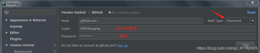 3.然后进行连接GitHub的配置(Auth Type选择密码Password)