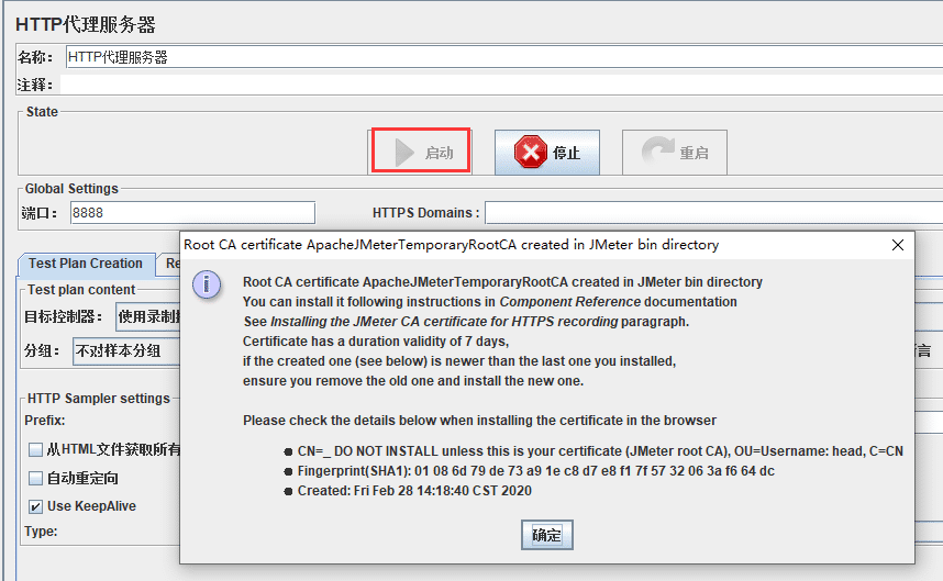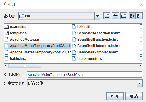 点击“启动”按钮,会在jmeter的bin目录下生成一个安全证书文件:ApacheJMeterTemporaryRootCA.crt