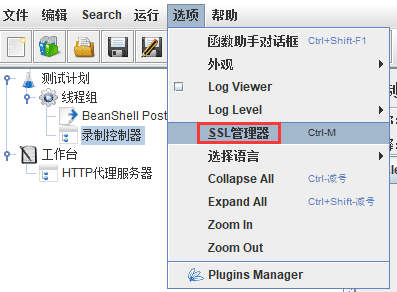 4、导入jmeter安全证书,在菜单选项→ssl管理器,导入jmeter/bin目录下的安全证书文件ApacheJMeterTemporaryRootCA.crt,这样录制https的代理服务器就启动并设置成功了