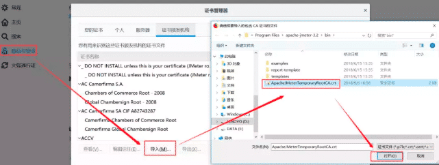 1、以火狐浏览器为例, 找到证书管理器→导入jmeter中bin目录下的安全证书→确定