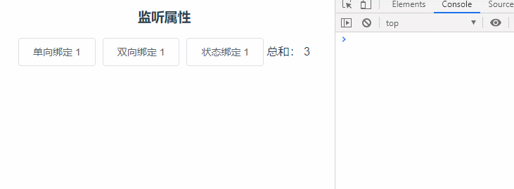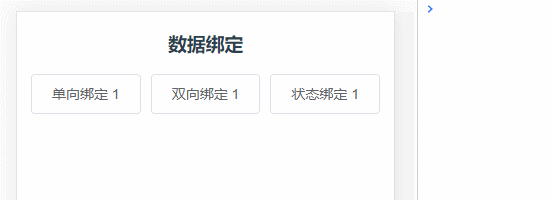 • 单向绑定,听名字就可以知道它并不具有双向绑定的特性或功能,它只会在视图初始化时绑定一次,这个变量即使后面发生了改变,视图也不会更新。可以从控制台看到singleVal 的值的确发生了变化,但界面中始终显示的为1。变量声明的方法和我们平时声明一个变量一样,如:let singleVal = 1,最后在return中返回。