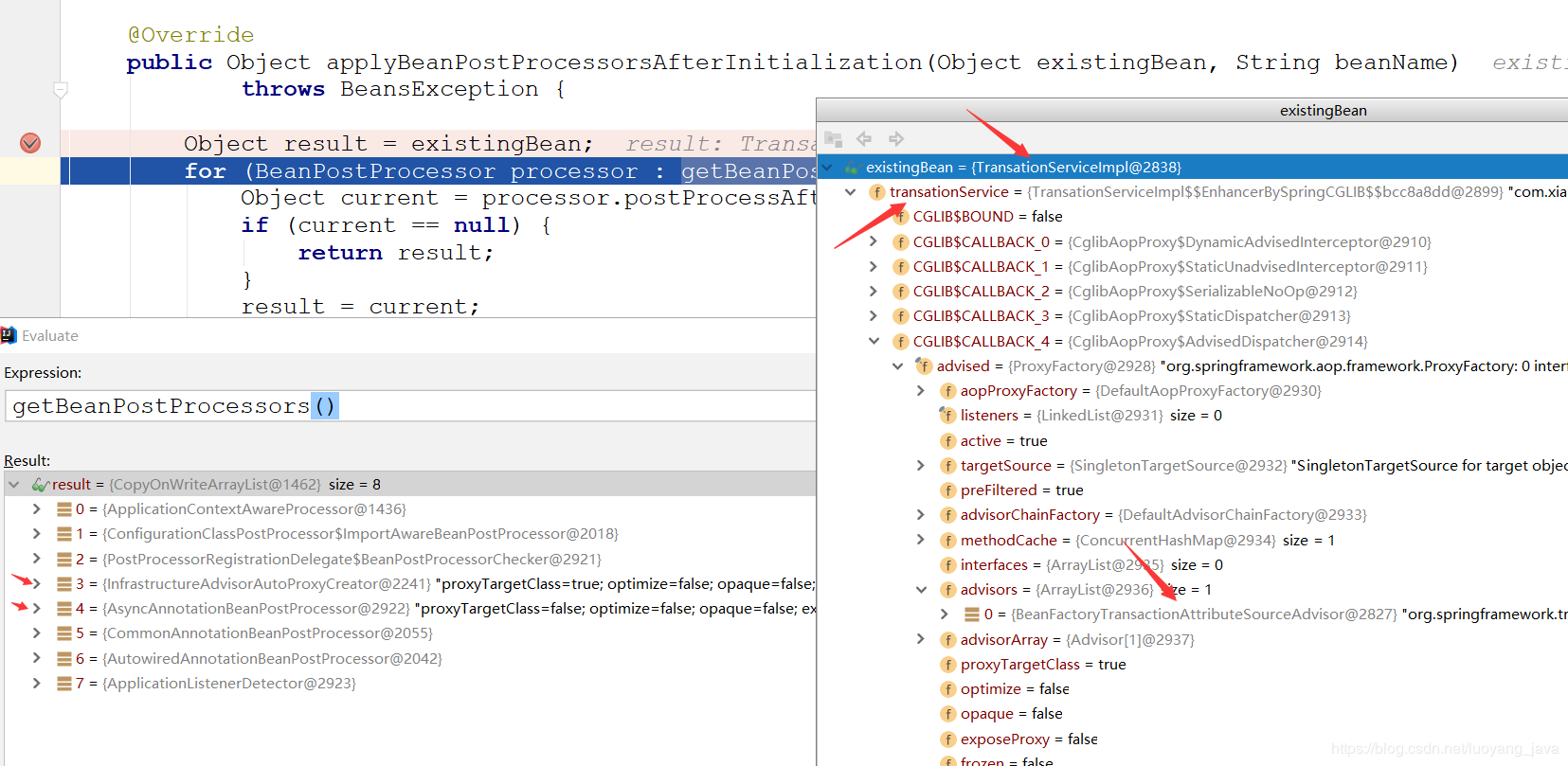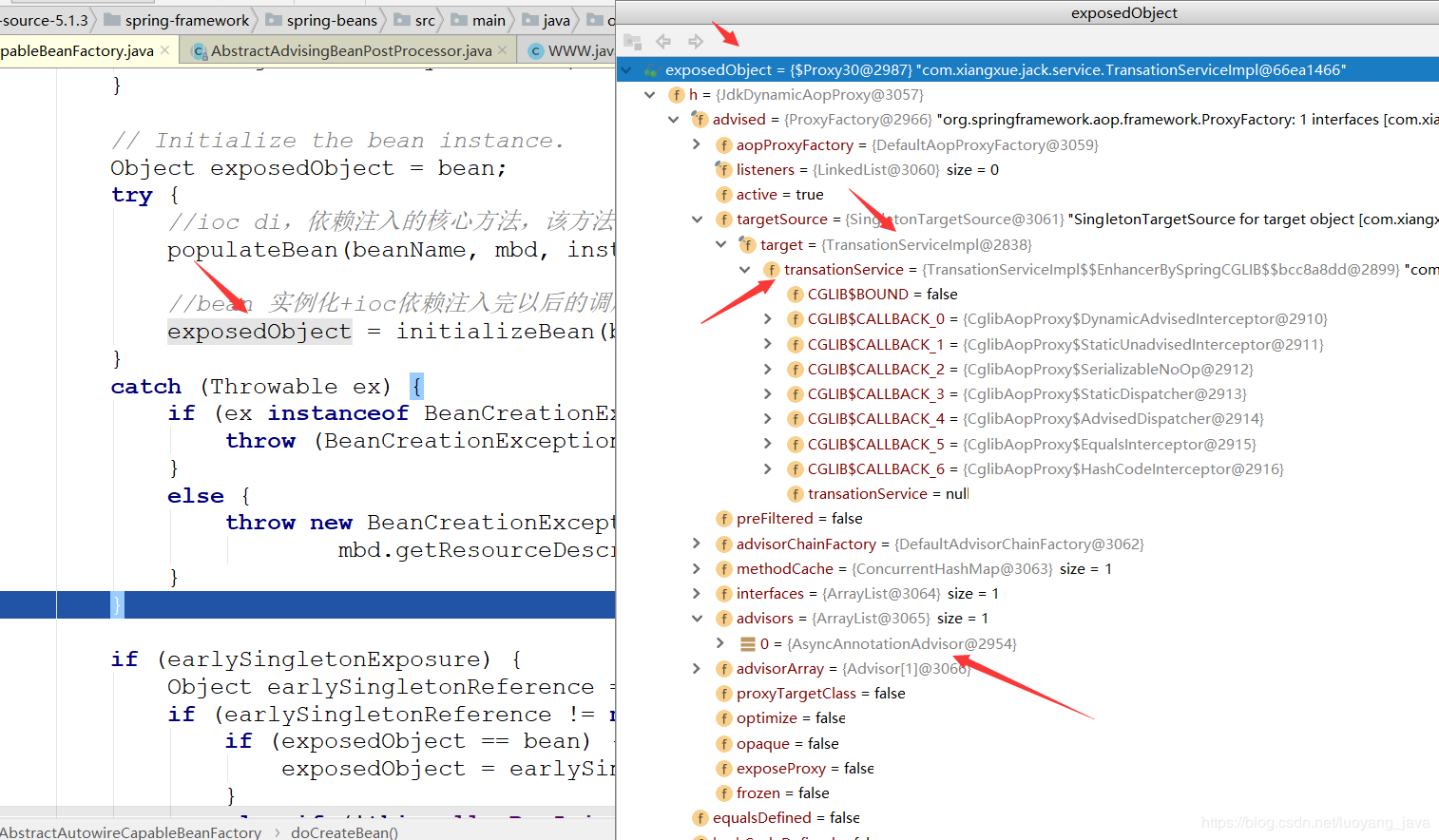 exposedObject是异步代理对象,在targetSource是代理对象的目标对象,目标对象中有一个transationService属性,这个属性是一个事务的代理对象,OK,从这里我们发现,我去,一个同样的类,居然生成了两个不同的代理对象,一个是异步的代理对象,一个是事务的代理对象,代理对象居然不一致了。为什么会这样,前面我已经分享得很清楚了