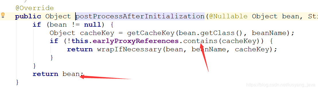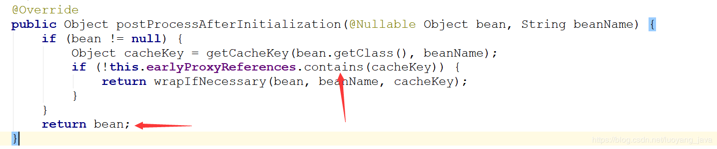 这里会判断earlyProxyReferences的Set容器中是否有这个cacheKey,这个cacheKey就是类的名称,而这个容器在提前暴露的三级缓存获取实例的时候就已经设置进去了,所以Set容器中是有这个类的