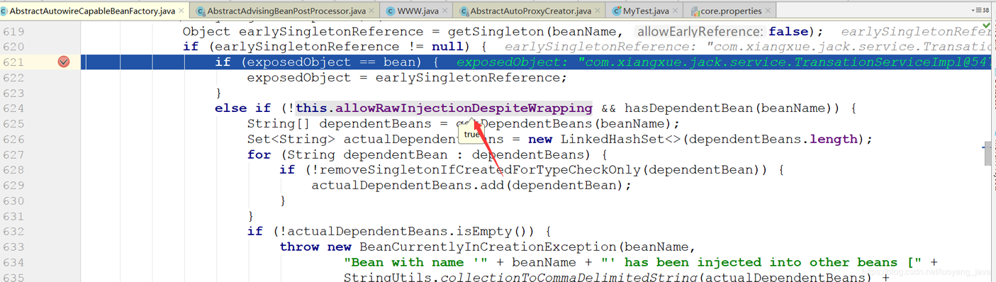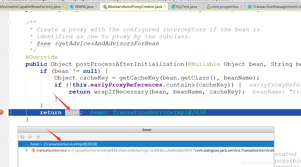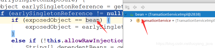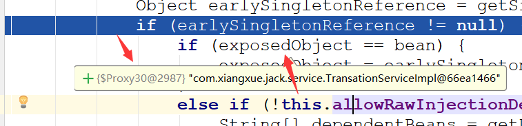 在这里已经在TransationServiceImpl的第二次getBean的时候从三级缓存中获取到了代理对象了,那么第二次的实例化已经完成了,并且已经依赖注入到了TransationServiceImpl的属性中了,这时候依赖注入已经完成了,好,我们还是接着第一次TransationServiceImpl的实例来讲,贴代码: