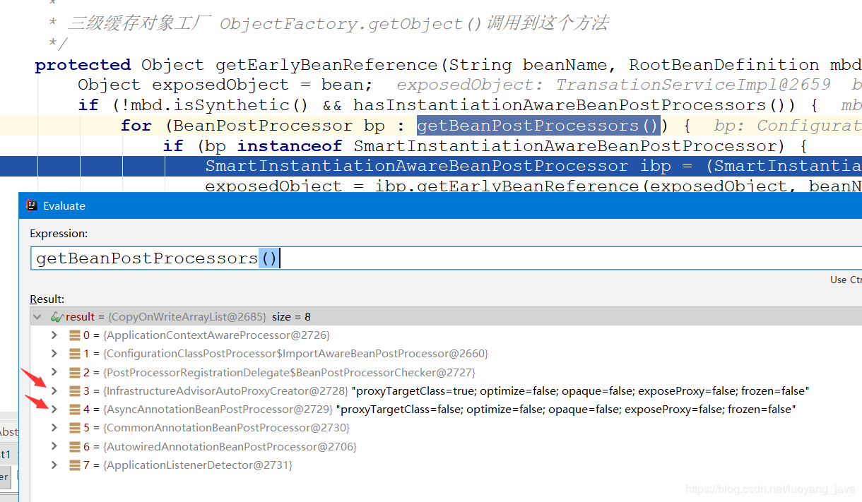3:是获取事务代理的BeanPostProcessor类型是SmartInstantiationAwareBeanPostProcessor类型的,所以事务代理的BeanPostProcessor会进来,然后生成代理