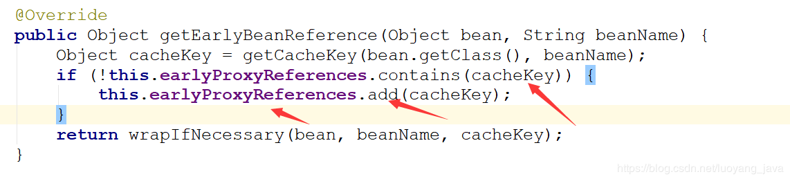 这里的cacheKey就是TransationServiceImpl业务类的bean的名称的字符串,然后会把这个字符串加入到一个earlyProxyReferences的Set容器中