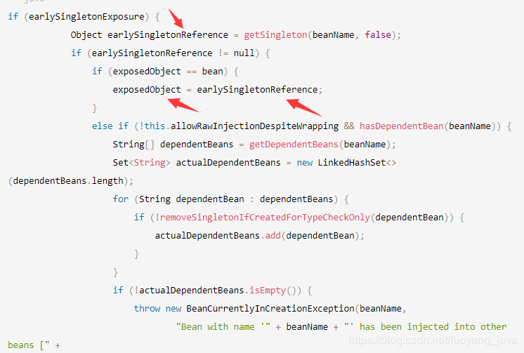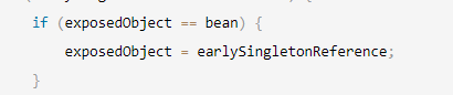 是从提前暴露的三级缓存中获取的代理对象赋值给了第一次实例化的bean对象,所以这个else if中可能出现异常的地方就不会走了,因为这两个bean exposedObject 和 bean是相等的。