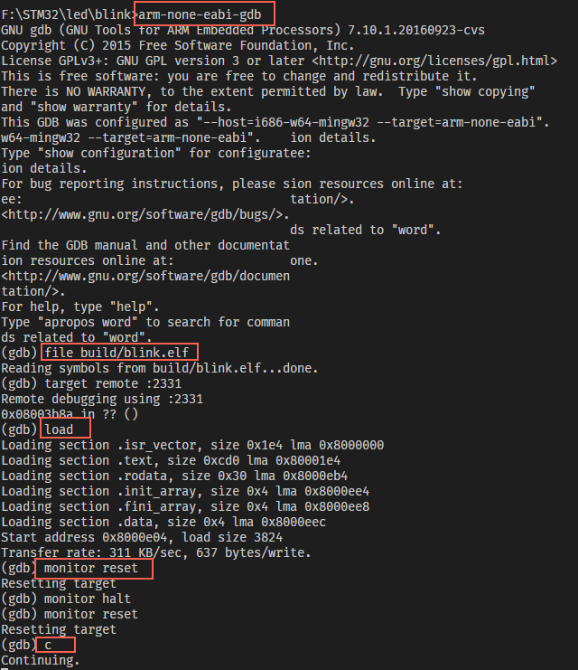 由于VSCode的配置文件中使用了较多的GDB指令,这里使用命令行先演示一下,方便理解,也刚好测试GDB是否正确安装。
