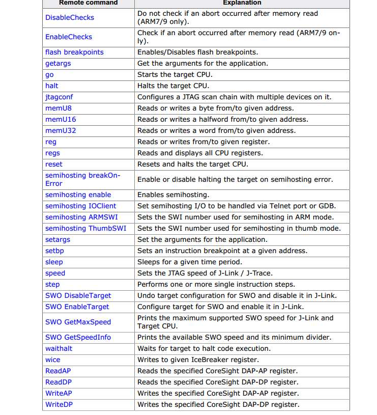 monitor 后面的参数不是gdb的指令,而是gdb server的(这里就是JLink Server的),这里参考JLink的文档(在安装目录下有),可以接受如下指令