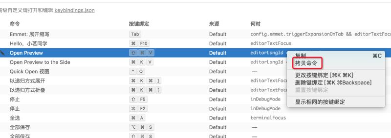 另外一种方法是直接打开快捷键设置,这里就能看到所有命令列表,右键可以复制命令:
