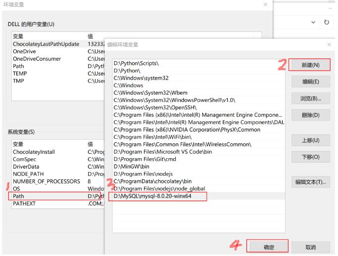 然后把mysql 8.0.20所在的路径D:\MySQL\mysql-8.0.20-winx64添加到环境变量Path中
