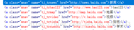 这些复数定位方式每次取到的都是具有相同类型属性的一组元素,所以返回的是一个list队列,我们也可以利用这个去定位单个的元素。比如百度首页种,右上角有新闻、视频、地图、贴吧等一些链接,我们通过f12查看源码可以发现,这些链接都有共同的class, 。