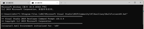 > "C:\Program Files (x86)\Microsoft Visual Studio\2019\Community\VC\Auxiliary\Build\vcvars64.bat"