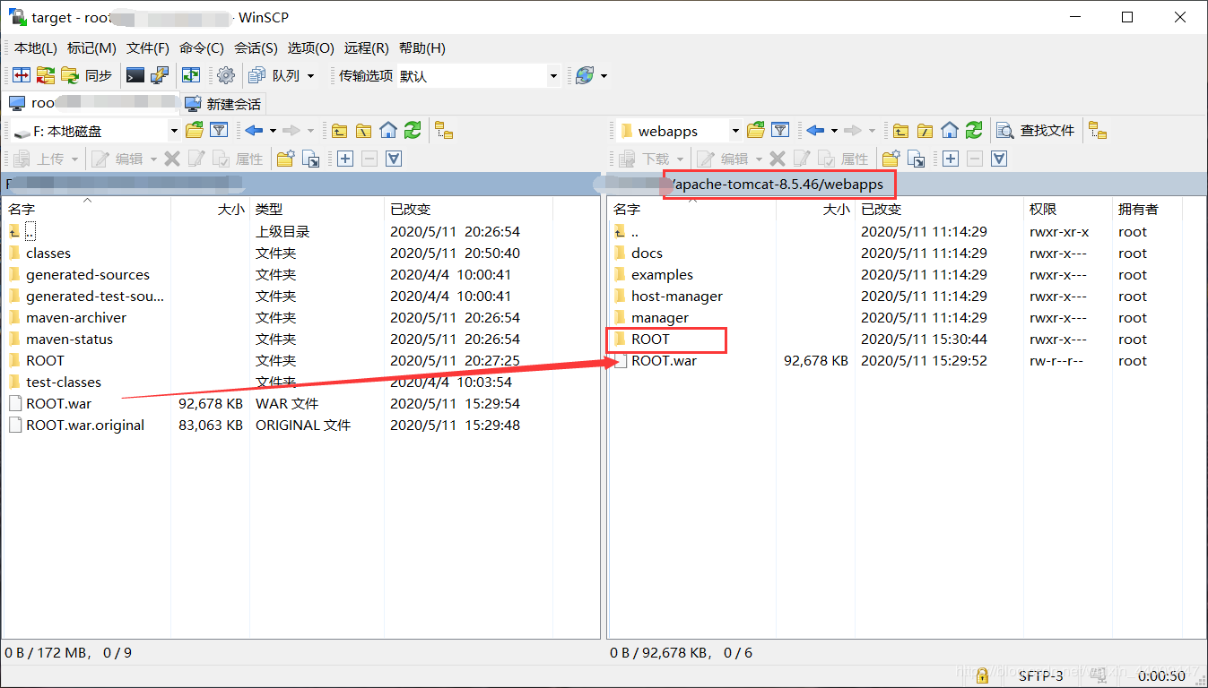 连接到服务器,将打好的war包tomcat安装目录下的webapps,启动tomcat,自动解析war包生成相应的文件夹,打开浏览器输入ip:(tomcat启动端口号)就可以进行访问了。(注意:在这个例子中我删除了webapps目录下原有的ROOT文件夹,并且把项目的名称改成了ROOT,所以直接用ip+端口号就能直接访问,但是如果不是这么操作的话,需要在端口号后面再加上项目的名称即可访问。)