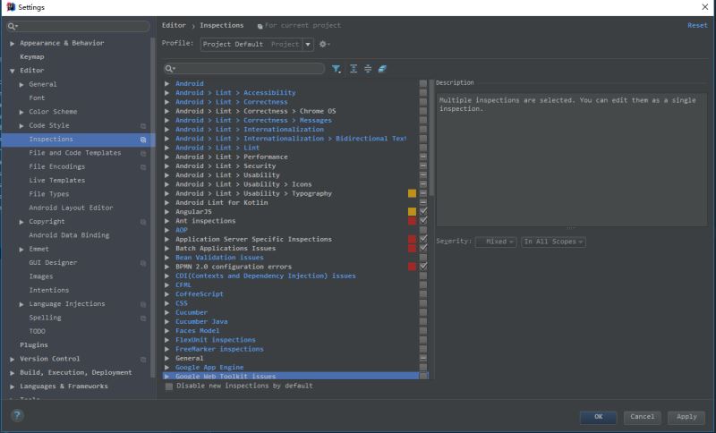 IntelliJ的代码检测功能非常强大,但也占用了一些资源,可以将默认的除 Error之外的其他级别的检测都去掉