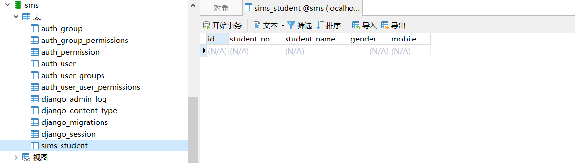 在本地MySQL创建sms数据库,修改项目的settings连接信息由默认的sqlite修改为MySQL