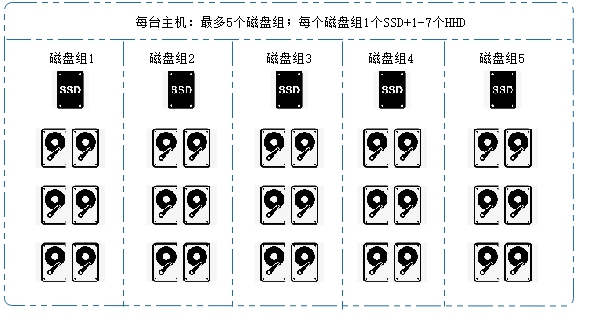 每个磁盘组最少一块SSD+1~7快HDD,每台主机不能多于5个磁盘组