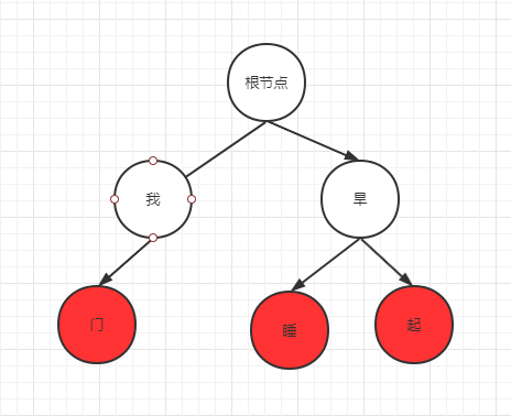 其中红色的点就表示词结束节点,也就是从根节点往下连接成我们的词。
